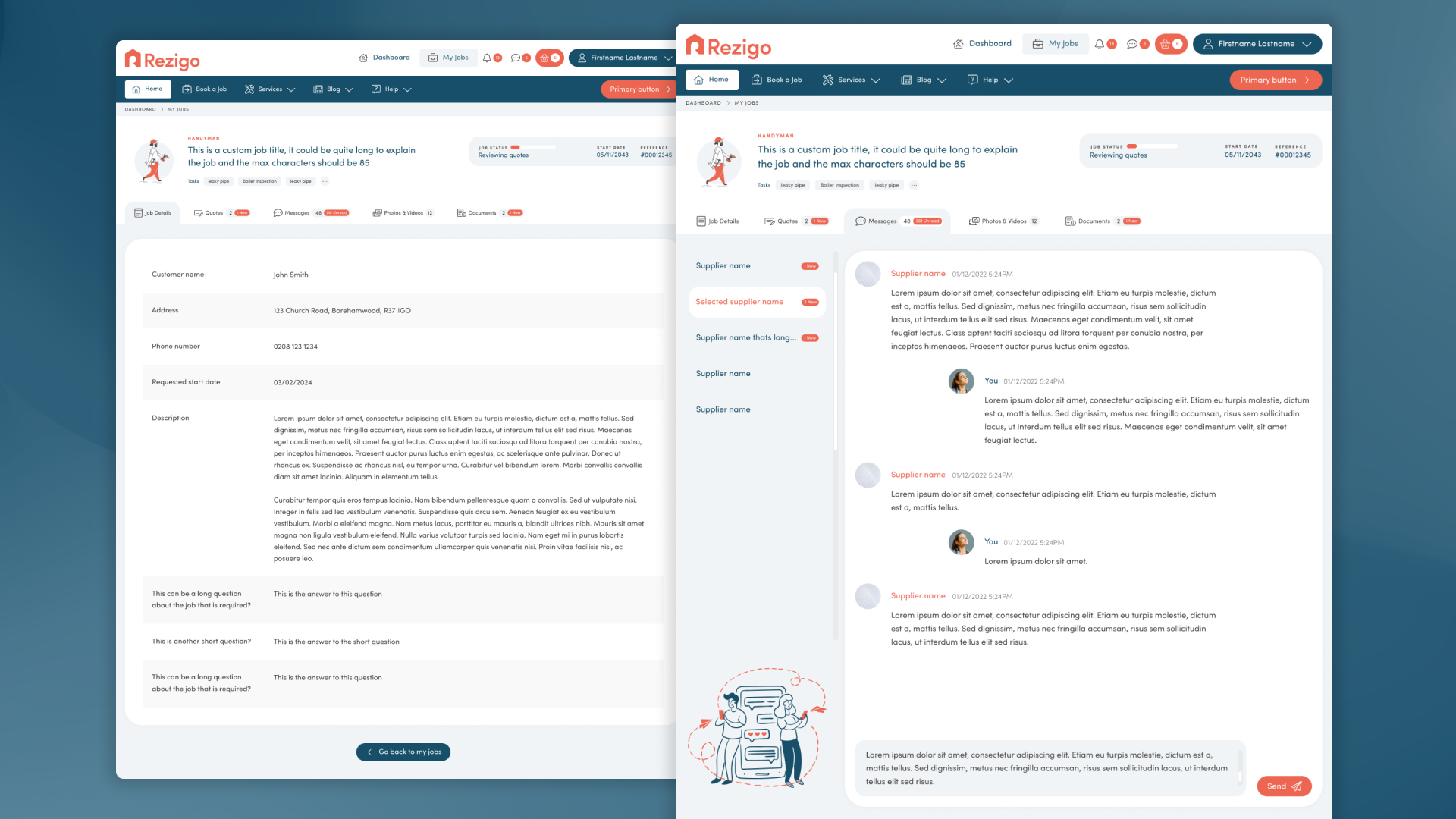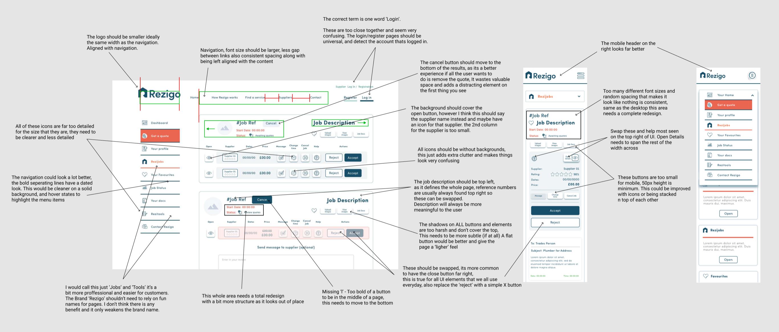 Previously the 'Job description' was stuck behind a popup, I redesigned it to be clearer in a list format. The 'Messages' were also difficult to navigate, with each chat being in a dropdown menu below each individual quote. The 'Messages' also received similar treatment, I used a format comparable to popular chatting apps such as Skype, with clean navigation between different conversations.