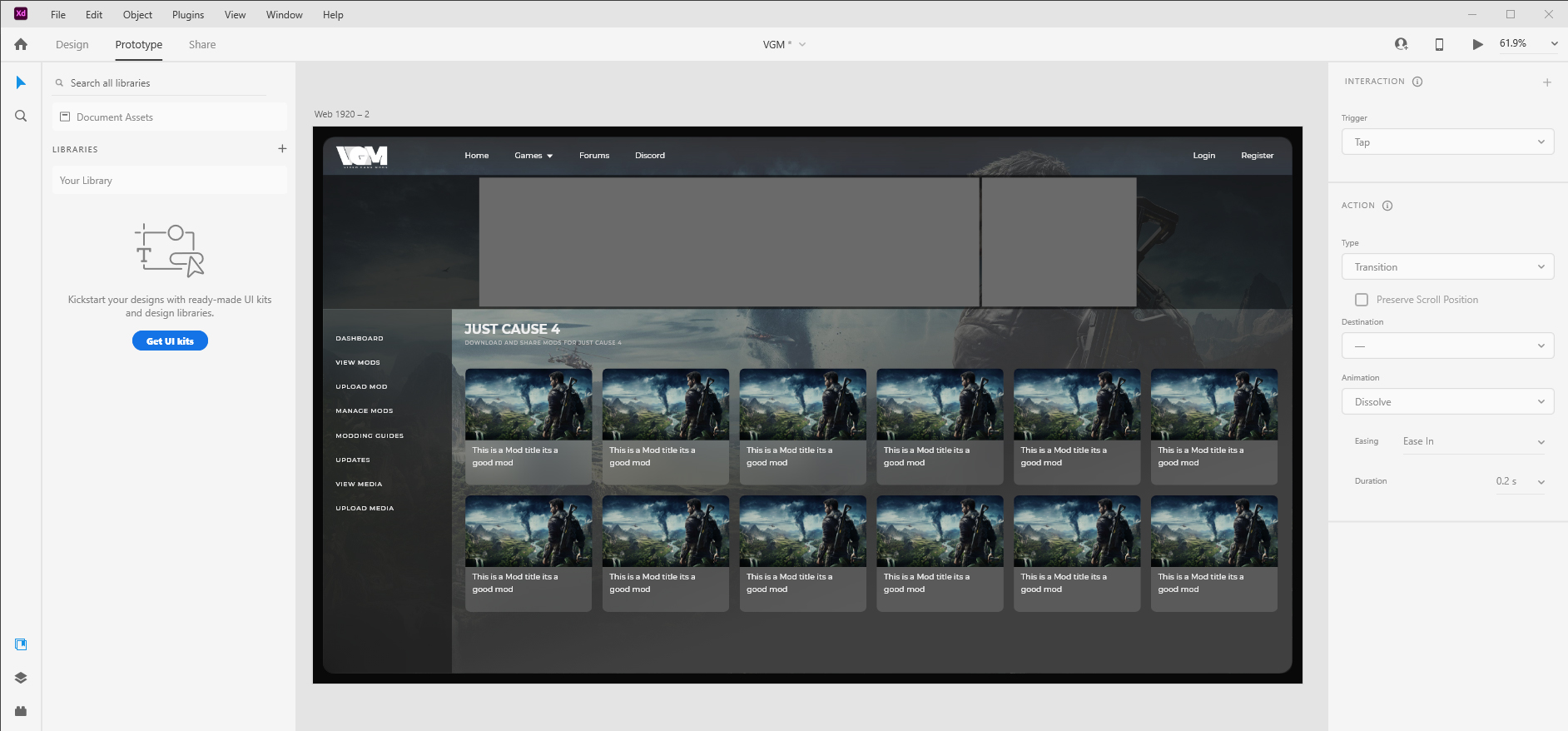 Using Adobe XD, I created a more updated version of how I wanted everything to look, this helped me nail down the proportions of the sidebar while managing to fit six tiles in a row on a 1080p screen.